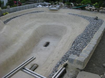 Links hinten entsteht gerade die künftige Wasserquelle aus einer Granitplatte (6 cm) und Granitpallisaden.