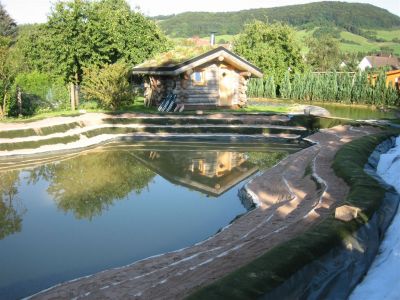 Schwimmteich mit Ufermatte und Mörtelaufkantung und Sand auf Ebenen