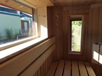 Neue Fenster in der Sauna3888 x angesehenmit Blick auf die Sonnenterrasse an der Querseite des Schwimmteiches und das Kiesbeet mit Bambus und Grässern.29. April 2013